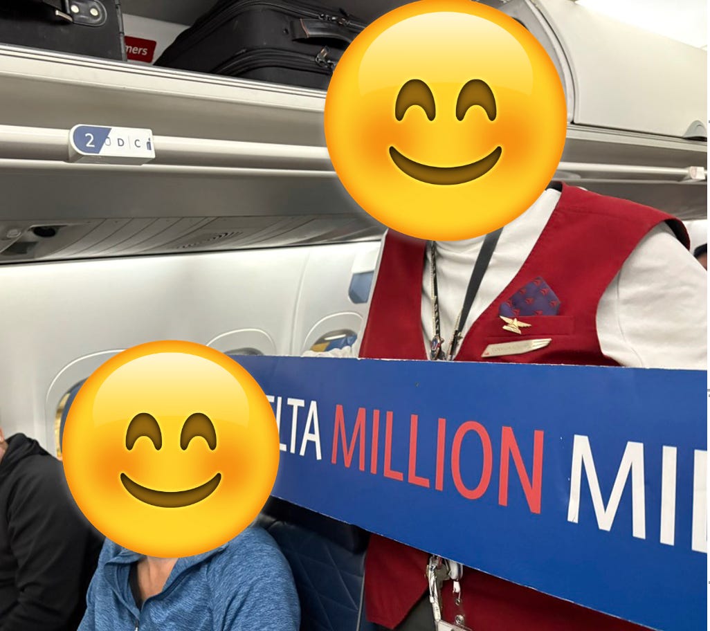 In my last post, I noted that Delta did a great job of celebrating a passenger who would be passing the one million mile mark on our flight. The gate agent came onboard to make a sincere congratulatory announcement, people took pictures and there was even a nice gift bag. And while the passenger and I joked about all the bruises one gets on the way to a million miles, it was a delightful moment that I could tell she appreciated (despite the lack of a pre-departure beverage to celebrate).