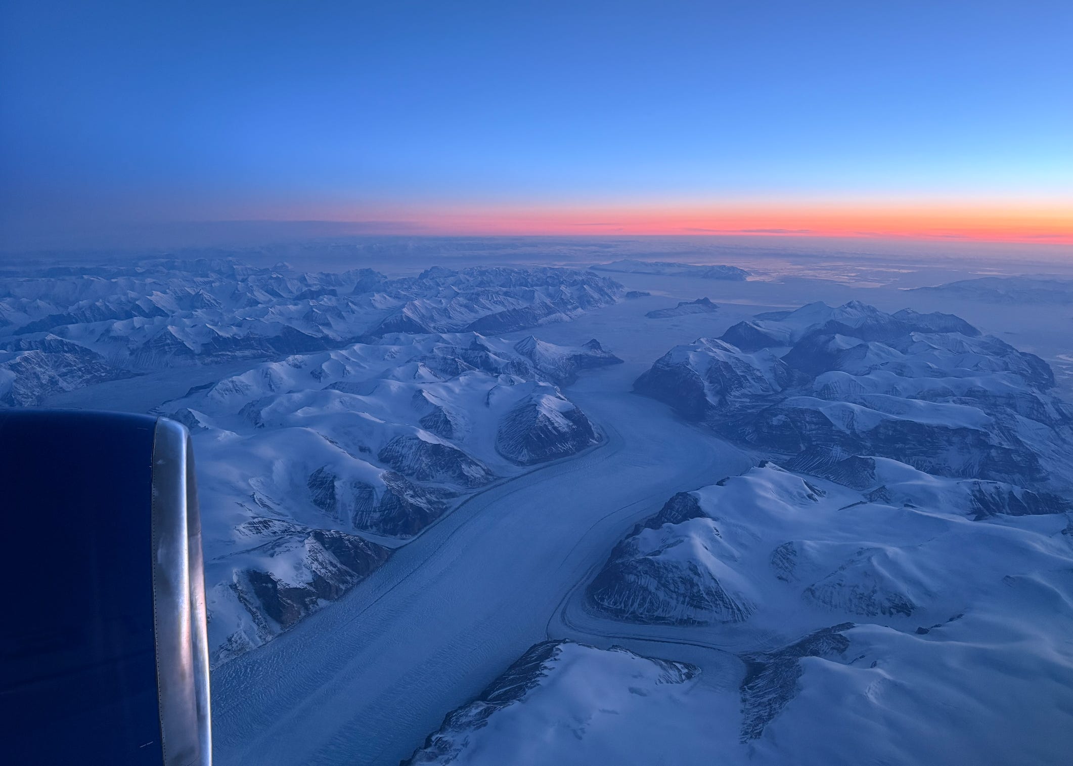 We’ve flown over Greenland many, many times. When it’s not covered by clouds, the scenery is absolutely spectacular. Still, we’ve never seen it look the way it did last week as we made a rare dusk flyover.5 It’s hard to believe it’s a real place.